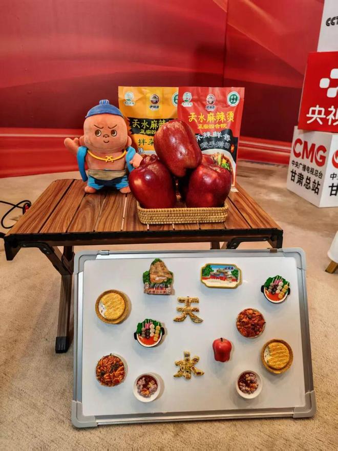 伏羲庙文创、大地湾人头彩陶瓶文创、麦积山系列文创、花牛苹果文创、天水美食猪油盒等总是供不应求。