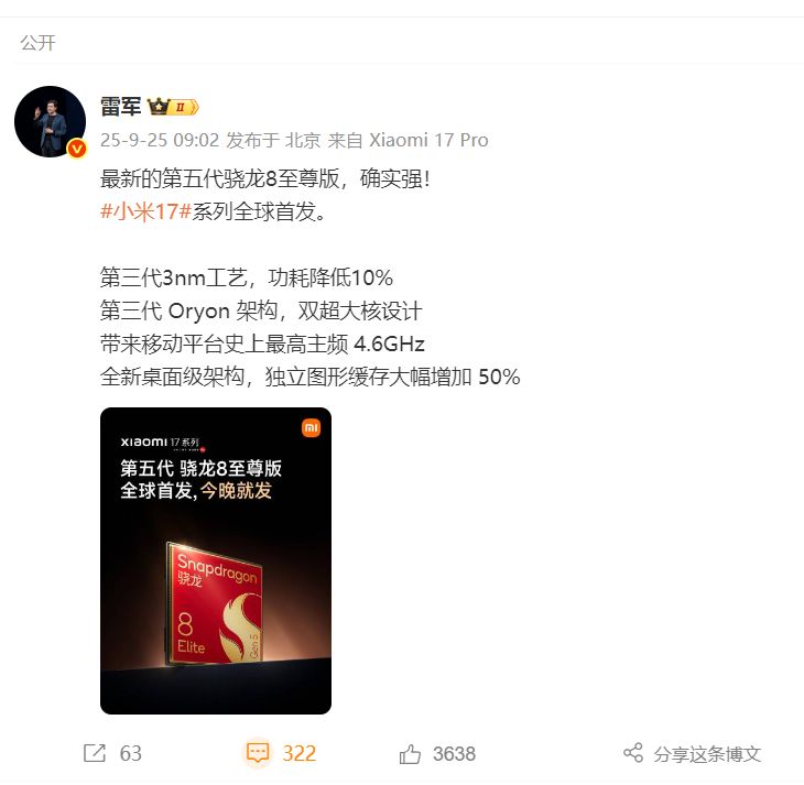 9月25日早间,小米澎湃OS官方微博正式宣布,小米17系列将于9月25日晚7点全球首发第五代骁龙8至尊版处理器。这款采用第三代3nm工艺的芯片,在功耗表现上相比前代有显著提升,为移动平台带来史上最高主频4.6GHz。