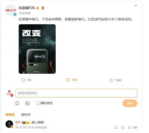 9月24日晚间,比亚迪汽车官方微博发文,预祝明天晚间发布的小米17系列手机成功,官方写道:“在质疑中笃行,于荒芜中探索,致敬追梦者们。比亚迪汽车祝小米17发布成功。”