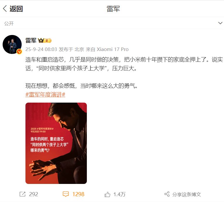 9月24日上午,小米集团董事长兼CEO雷军在微博发文称,造车和重启造芯几乎是同时做的决策,把小米前十年攒下的家底全押上了。说实话,“同时供家里两个孩子上大学”,压力巨大。现在想想都会感慨,当时哪来这么大的勇气。