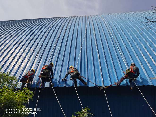 2.现场清理与安全布设:清理彩钢瓦表面杂物,拆除松动附件;在作业区域下方设防护网与警示标识,高空作业人员系双钩安全带,配备防滑鞋与安全帽;接通高压清洗机,先冲洗表面浮尘,再用中性清洁剂擦拭油污,干燥后检查基面清洁度。